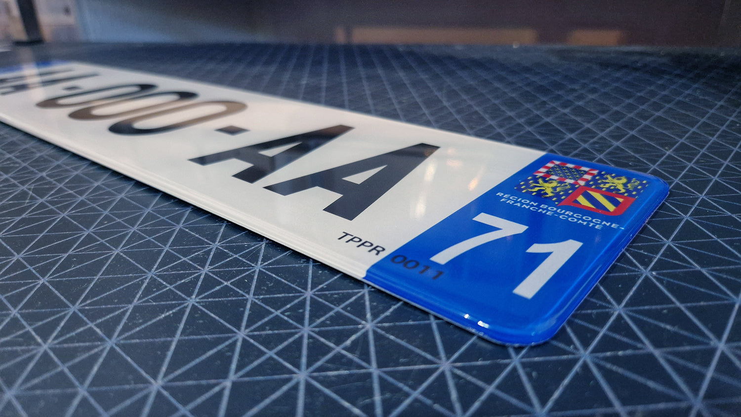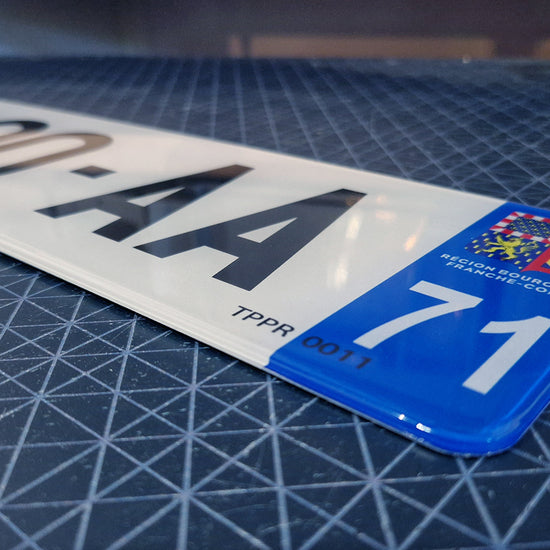 Notre spécialité : la plaque d’immatriculation “coulée”. Contrairement aux plaques en PET standard avec des bords tranchants, usinés et rainurés grossièrement, la plaque coulée possède des bords arrondis. Un rendu haut de gamme et conforme à la législation française.